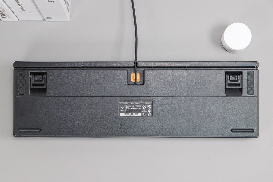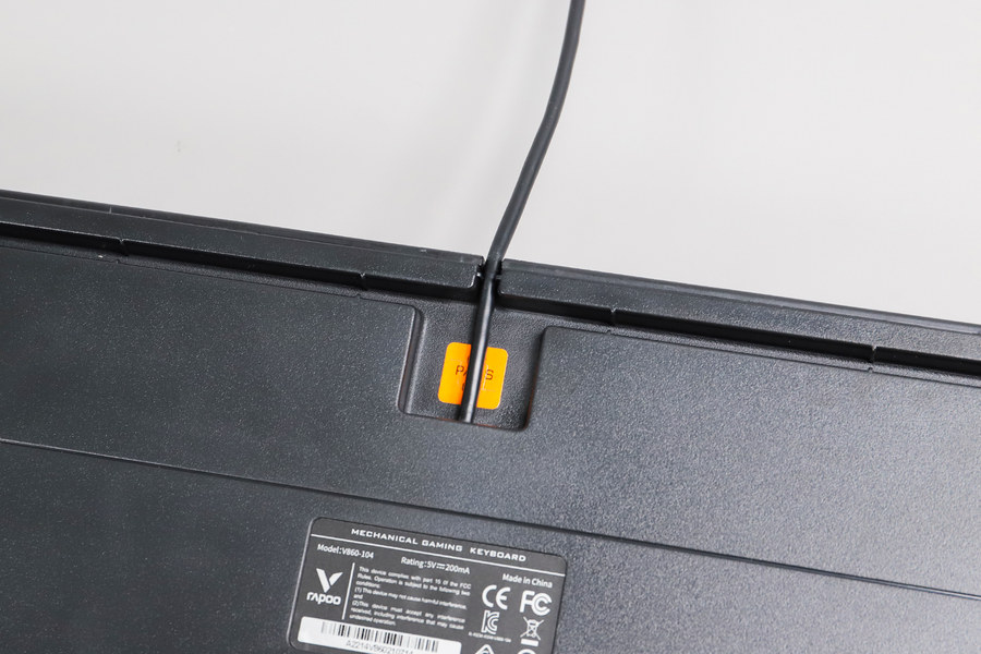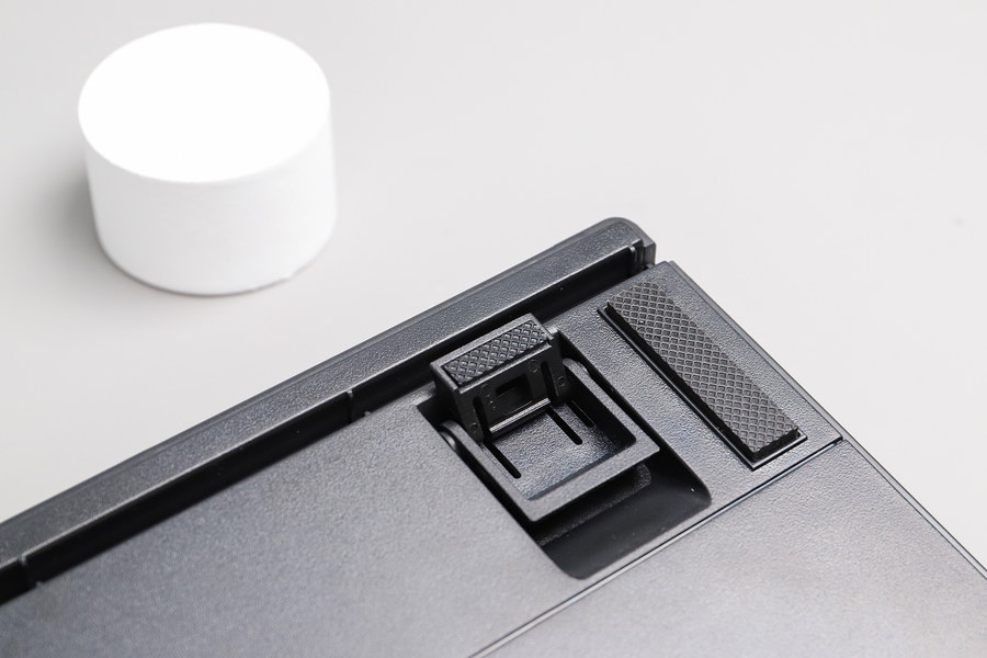 键盘背面采用三出线口设计,线材可以从三个方向灵活走线,配备的凹槽可以收纳键盘线,保证桌面的整洁,这点小细节非常贴心。