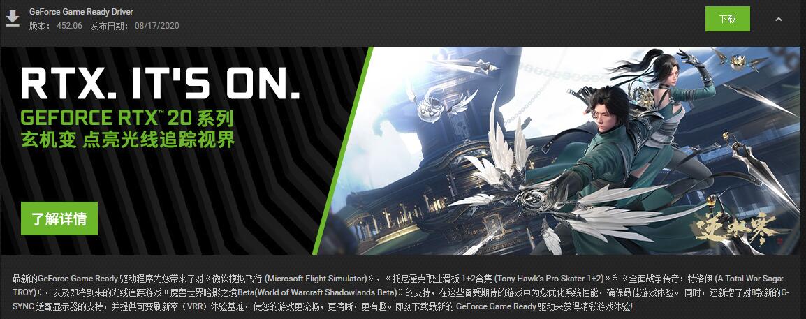 8月19日消息,英伟达与近日发布新显卡驱动,版本号为452.06,该版本驱动添加对《微软模拟飞行(Microsoft Flight Simulator)》,《托尼霍克职业滑板1+2合集(Tony Hawk's Pro Skater 1+2)》和《全面战争传奇:特洛伊(A Total War Saga:TROY)》,以及即将到来的光线追踪游戏《魔兽世界暗影之境Beta(World of Warcraft Shadowlands Beta)》的支持,在这些备受期待的游戏中为您优化系统性能,确保非常好的游戏体验。同时还新增了对款新的G-SYNC适配显示器的支持,并提供可变刷新率(VRR) 体验基准。