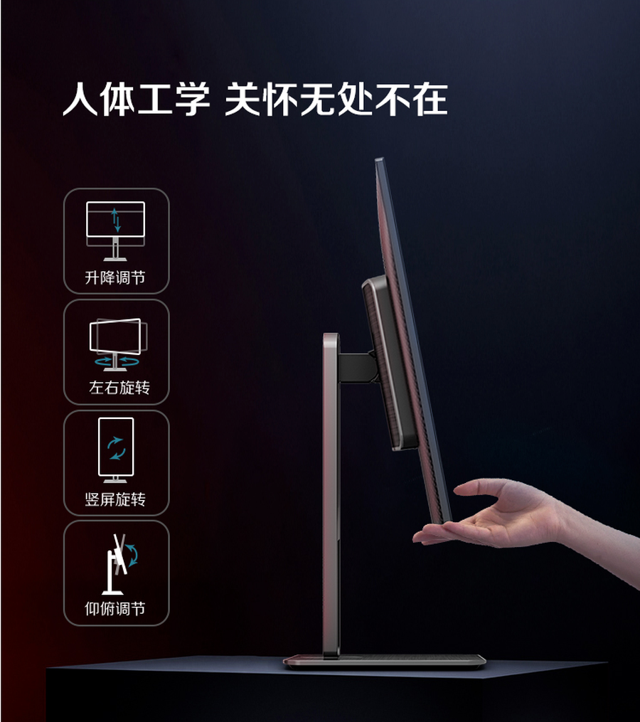 四周极窄边框,组建多显示器阵列能提供更好的沉浸感。镭射工艺的金属承重人体工学支架,能够同时调整上下左右与俯仰,给用户最合适的使用角度。