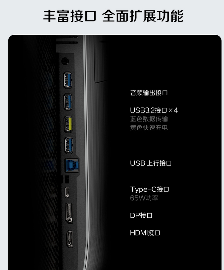 接口方面,除了常规DP、HDMI接口,同时拥有音频输出接口,USB上行接口,4个USB3.2接口,Type-C接口。其中Type-A接口支持为手机快速充电,全功能Type-C不仅支持画面传输,更能为设备提供高65W反冲,连接笔记本一根线便能解决画面+供电,让桌面更加整洁。