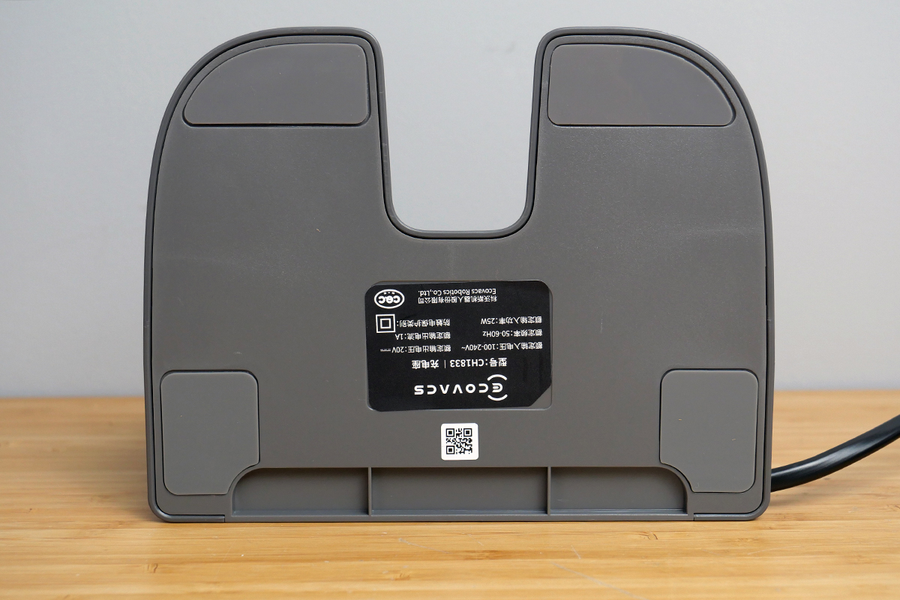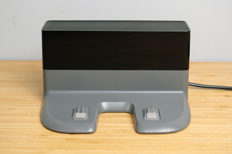 充电底座底部贴有四块硅胶脚垫,可以将底座稳固的固定在地面上,避免在扫地机的推动下在地面来回滑动。