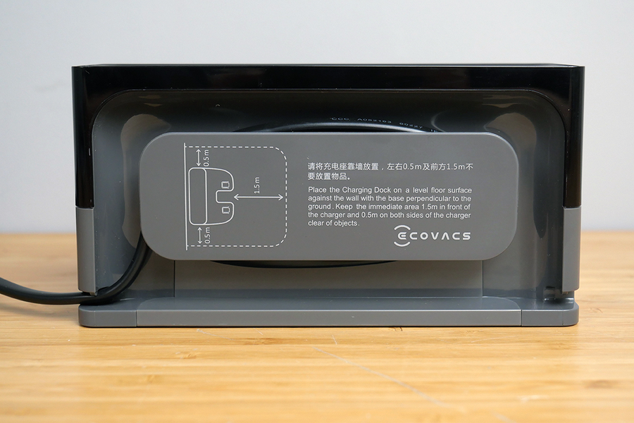 在充电底座的背面提供了理线器,可以将多余的电线隐藏在充电底座内,这样会让家庭摆放更加的整洁。同时在充电底座背面也写有摆放注意事项,方便用户选择合理的位置。