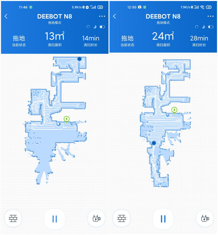 科沃斯DEEBOT N8在清扫时会按照区域进行划分,先清理一部分区域,随后再进行另外区域的清扫。从清扫路径可以看到,科沃斯DEEBOT N8能够快速的完成地图建模,并且针对清扫地图及家庭摆设进行更科学的路径规划。