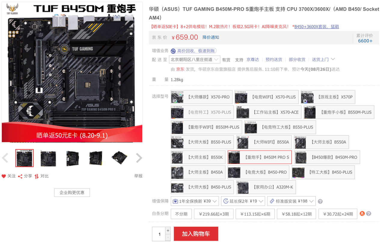 首先推荐超高性价比的华硕B450重炮手主板,该款主板供电和散热再次强化升级,还配备疾速2.5G有线网卡,更有AI麦克风降噪、BIOS一键升级等一系列电竞增效技术,提供卓越游戏性能,新一代“B450M板皇”实至名归。现京东售价仅659元,9月1日前下单还可参加晒单返50元E卡活动,有兴趣的朋友一定不要错过。