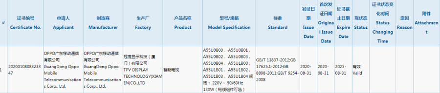 从网上公布的信息看,正式入网的OPPO电视搭载55英寸屏幕,生产厂商为冠捷显示科技(厦门)有限公司,其它暂时没有更多的信息。此前OPPO曾经透露将要进军电视行业,这次OPPO电视通过3C认证,代表着OPPO电视很可能在不久后就会和大家见面。