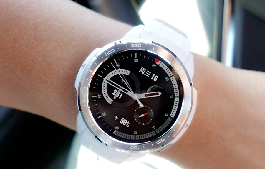 荣耀手表GS Pro有极地白和碳石黑,相比之前荣耀家族的产品都要更厚、更重、更“魁梧”,不含表带的重量就已经达到45.5克,一看就是很扎实硬朗的感觉。表带的表面也做了喷砂效果的工艺,表冠也采用金属材质可以更好的保护表镜,侧边功能键也为金属材质,总之种种细节都在迎合高阶户外探索者的需求。