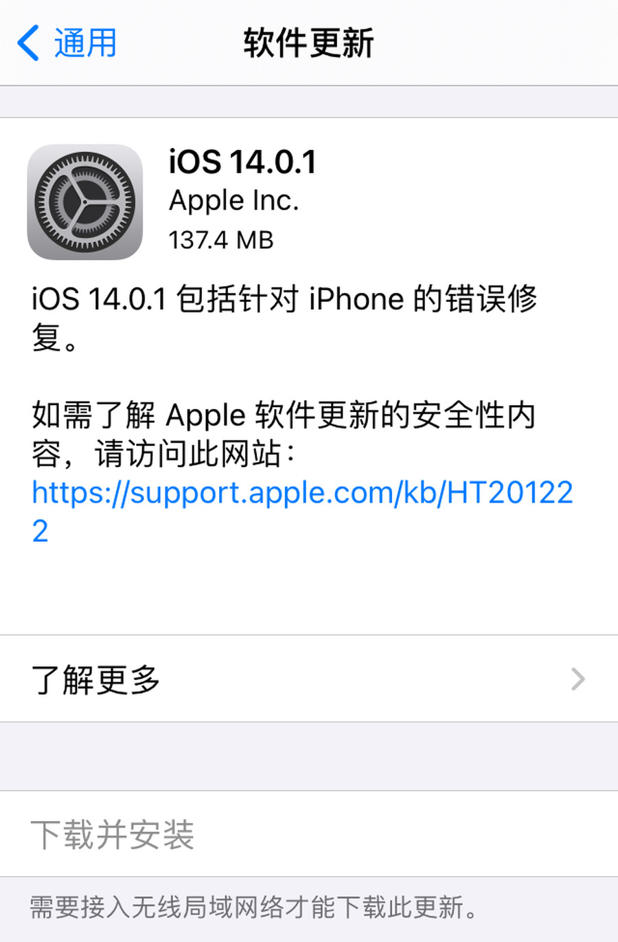 9月25日消息,今日凌晨苹果推送了iOS 14.0.1的正式版更新,在本次的iOS 14.0.1更新中,修复了一系列的bug,包括相机预览无法再iPhone 7系列机型正常显示的问题,还有部分iPhone无法加入无线局域网的问题。需要值得注意的是此次更新距离上次iOS 14正式版更新不足15天。