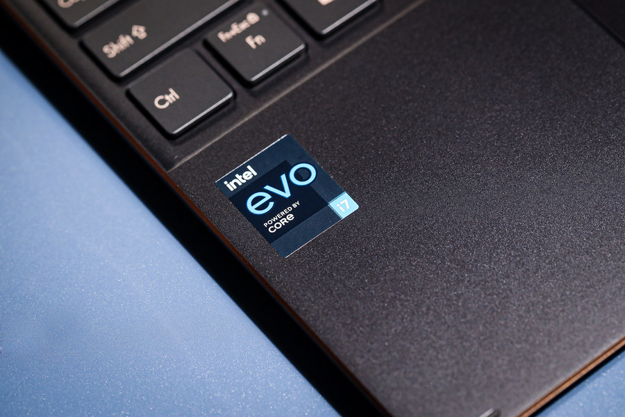 在C面左侧掌托的位置,我们可以看到全新的英特尔EVO平台认证的贴纸。
