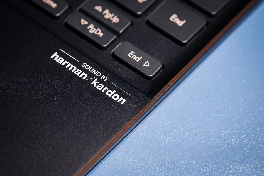 右侧掌托则标注有哈曼卡顿的标志,预示着这款轻薄笔记本在音质方面也有着出色的表现。