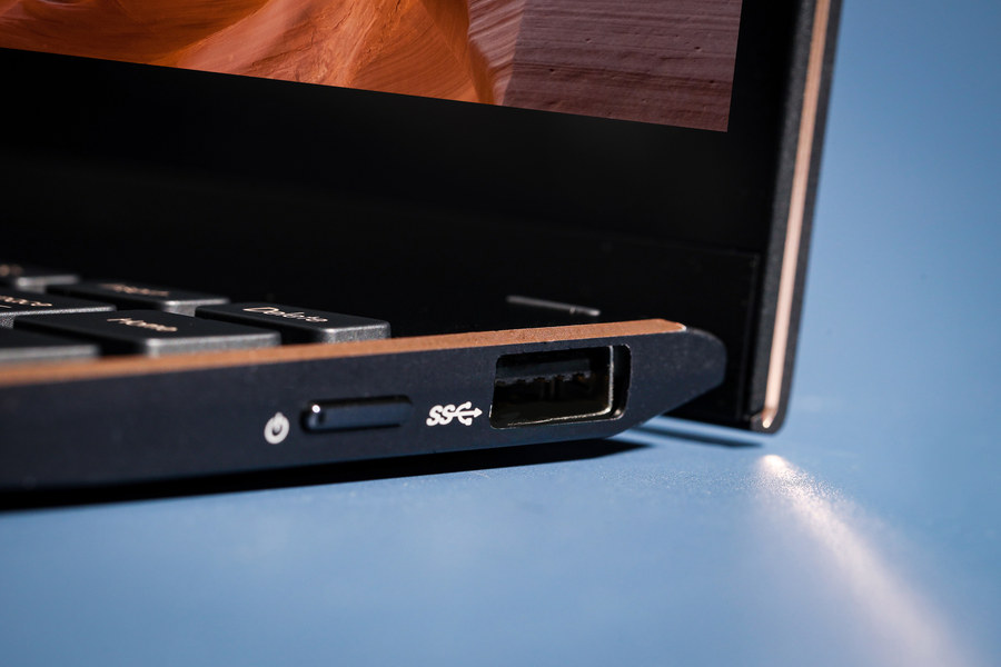 华硕灵耀X逍遥的C面在设计上起到了点睛之笔的作用。在黑色的机身主体上,C面的边缘采用了铜色的点缀,让机身看起来更有高贵感,突出了其高端轻薄笔记本的定位。