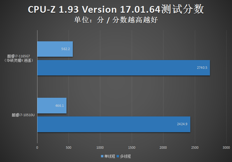 通过CPU-Z这款软件的测试成绩来看,酷睿i7-1165G7在性能方面相比上代酷睿i7-10510U大幅提升,特别是在单核性能方面,提升幅度相当之大,表现令人欣喜。