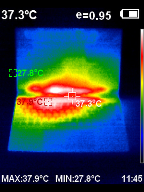 笔者对这款笔记本的键盘面进行了红外线热成像测试。测试方法为:开启PCMARK 10现代办公测试项目10分钟,然后利用红外线热成像仪测试键盘面的温度。