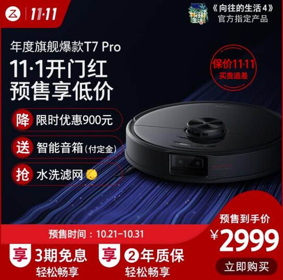 石头扫地机器人T7 pro将在10月21日-30日开启预售,原价3899立省900元,到手仅2999,价保双十一,付尾款前1000名加赠水洗滤网。让用户在双十一之前便能提前体验不用扫地拖地的轻松生活。