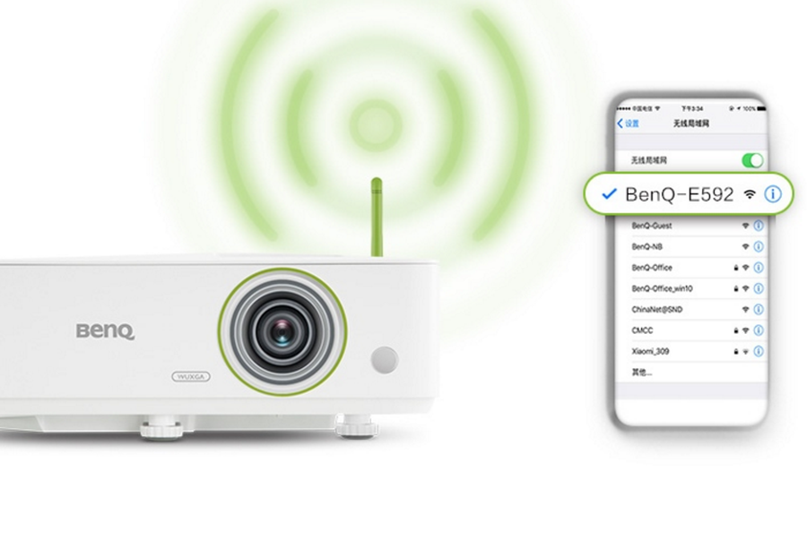 为了提供商务会议更多的便利,明基E592还自带热点,通过小绿尾天线可以直接无线连接投屏。同时还有双路WiFi,无限投屏的同时还能用同一台智能设备实时上网,不占用热点。并且提供5G和2.4G双WiFi通道,可根据网络环境自动切换,灵活适应不同的会议场景。