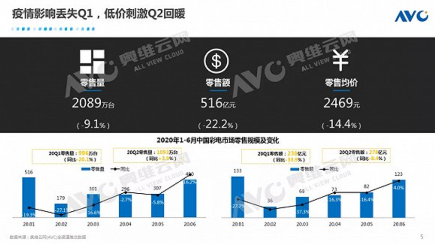 目前国内电视行业属于存量市场,增长速度放缓。从奥维云网公布的2020彩电市场H1总结报告可以看到,因为疫情影响,Q1中国彩电市场规模丢失近三成,上半年中国彩电市场零售量同比下降9.1%,竞争更加激烈。