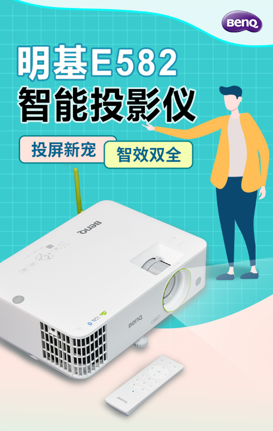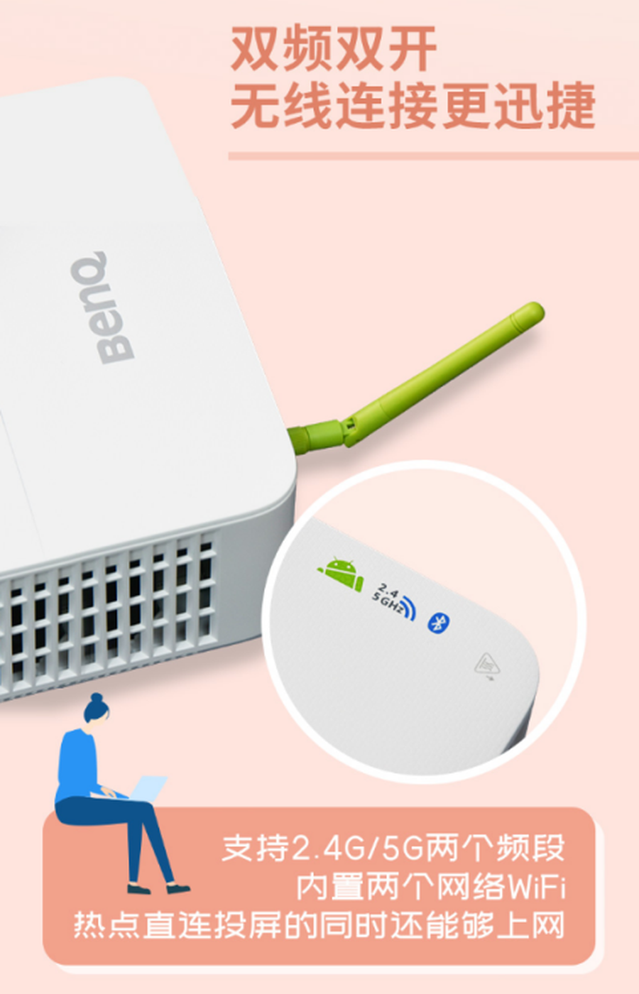明基E582还是一款智能化程度非常之高的投影仪,相信用惯了智能手机的你,使用明基E582智能投影仪也会非常非常地容易。它自带热点,通过小绿尾天线可以直接无线连接投屏。同时还支持双频双开,即双路WiFi功能,智能设备在无线投屏的同时还能实时上网,不占用热点。并且提供5G和2.4G双WiFi通道,可根据网络环境自动切换,灵活适应不同的使用场景,会议中能一边报告一边收发信息,生活中投屏手机就能畅享手机账号的视频会员。
