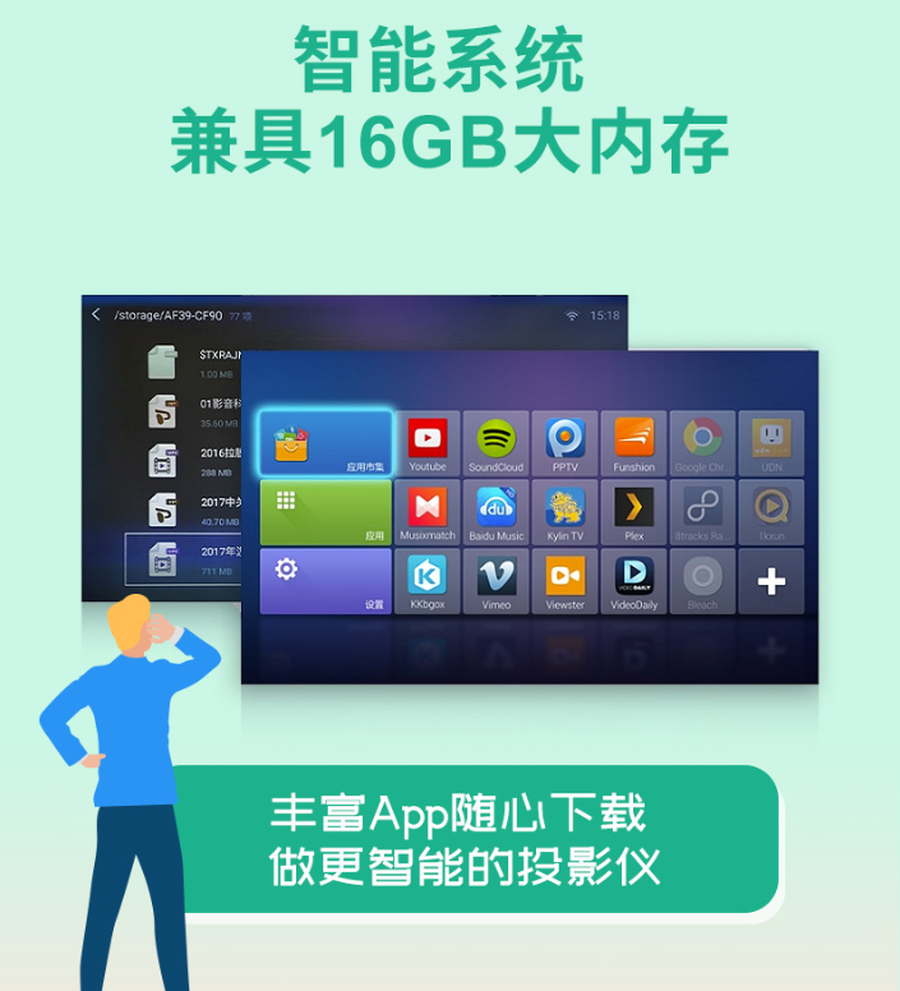 这款智能投影仪内置16GB超大存储空间,用户可以从应用市场下载需要的办公学习软件和影音APP,或者直接将所需的文件材料直接存储在本地。此外,它还内置了定制化的WPS办公软件,常用的文档格式它都能直接播放,office 三件套、PDF、图片、视频,统统不在话下。