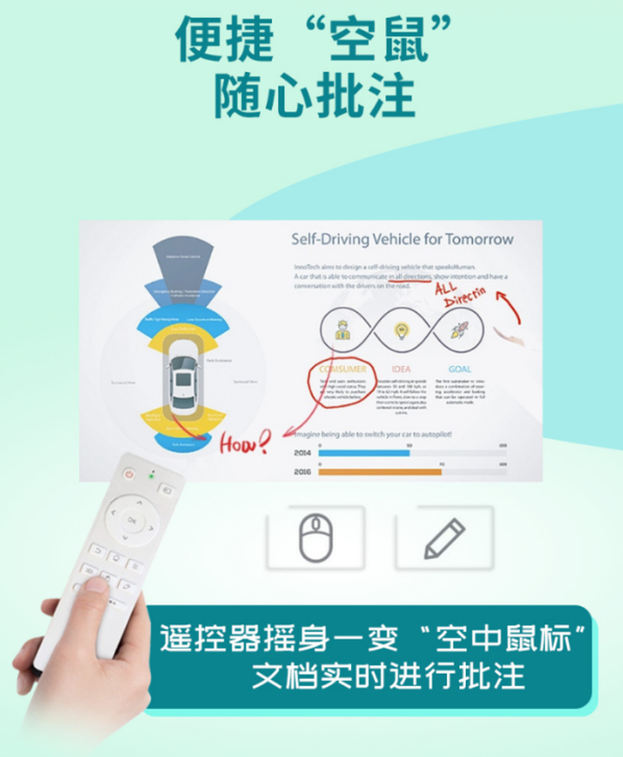 明基E582智能投影仪还搭载了语音控制、空鼠遥控批注等功能,可通过语音助手直接跳转菜单、搜索功能,也可通过空鼠功能对准一按,即刻选中。甚至还能调出画笔,对投屏画面进行批划注释,让它的遥控器摇身变成“空中鼠标”。