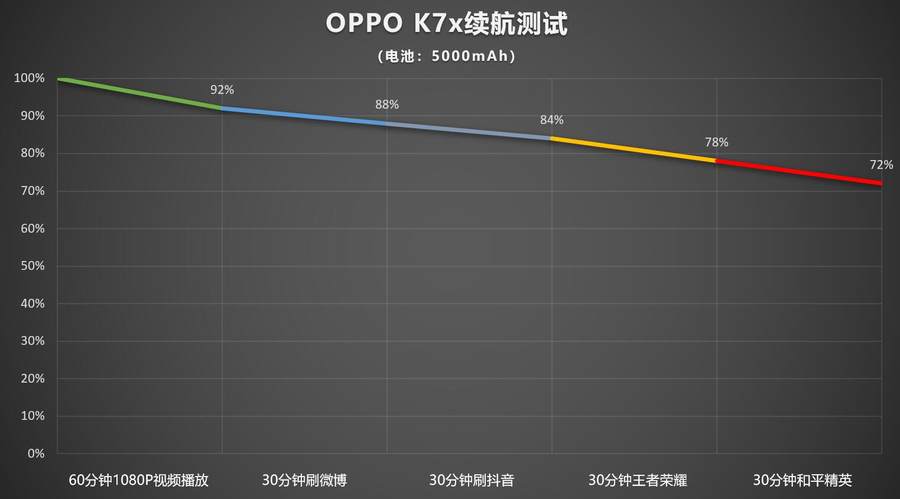 具体续航测试结果如上图,经过3个小时连续续航测试后,OPPO K7x仍旧能够剩余72%的电量,这样的表现比近期测试的绝大部分手机都要好。如果你在60Hz刷新率模式下使用,理论上还会有更好的续航表现。从实际使用看,即使是略重度使用的用户,OPPO K7x的续航也能轻松支撑一天。