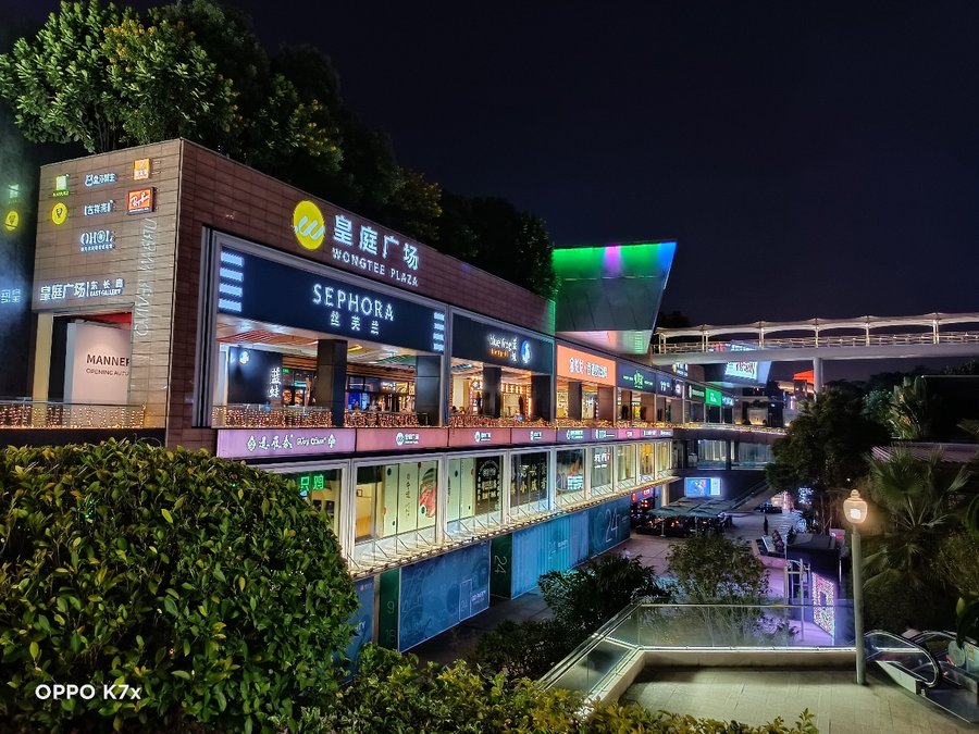 OPPO K7x还支持夜景模式,手持状态下就能使用。在上面对比样张中,灯光环境复杂,而夜景模式下对高光部分的压制明显更到位,灯箱等高光部分的字体细节丰富许多,可以提升整体观感。