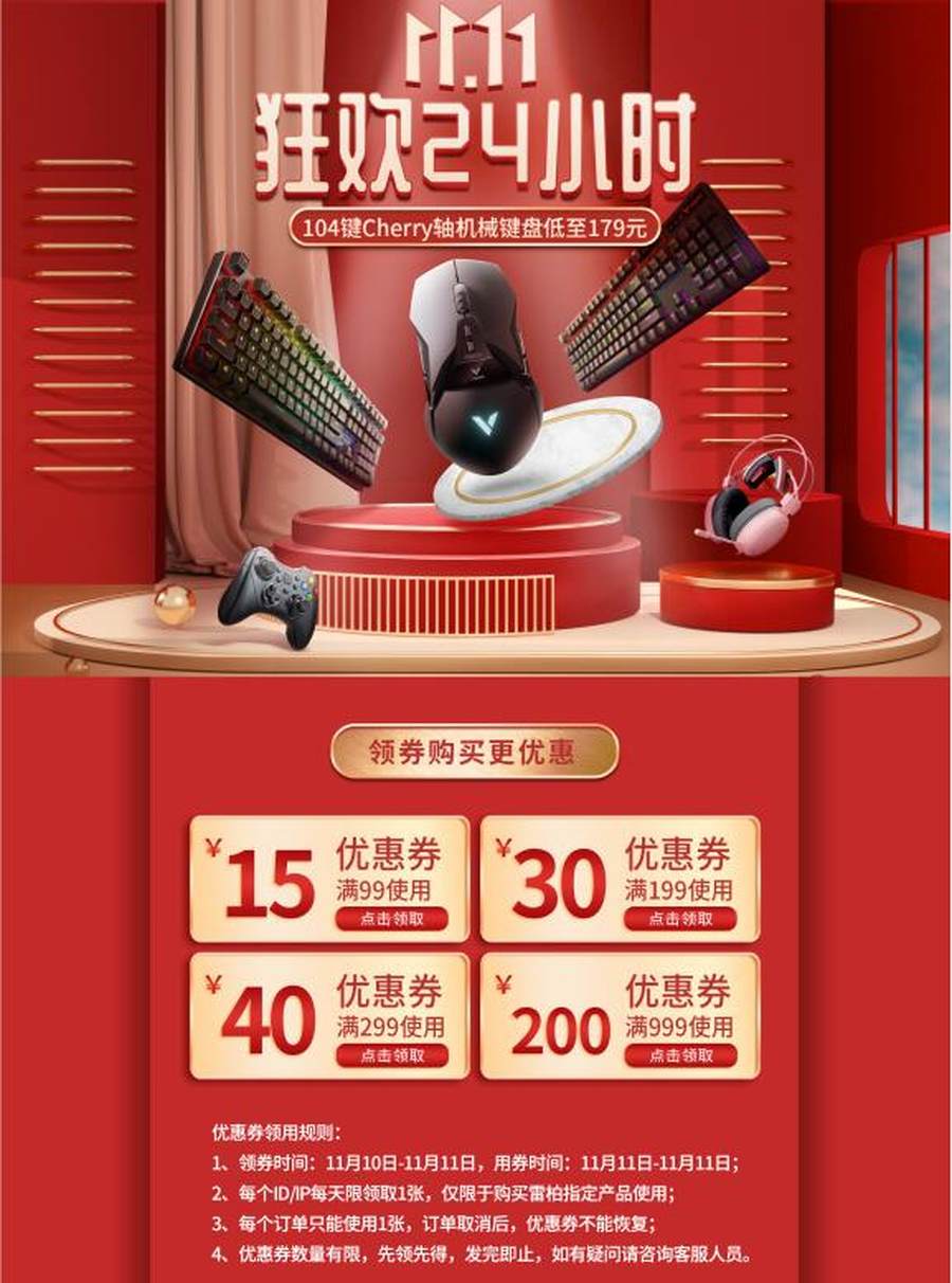 除了上面提到的产品,活动页面还准备了丰富的外设可供选择,都有不同程度的优惠。部分产品型号领券满99减15元、满199减30元、满299减40元、满999减200元。领券时间为11月10日到11日,在双十一当天使用优惠券购买更加优惠,先领券后购买更加优惠。