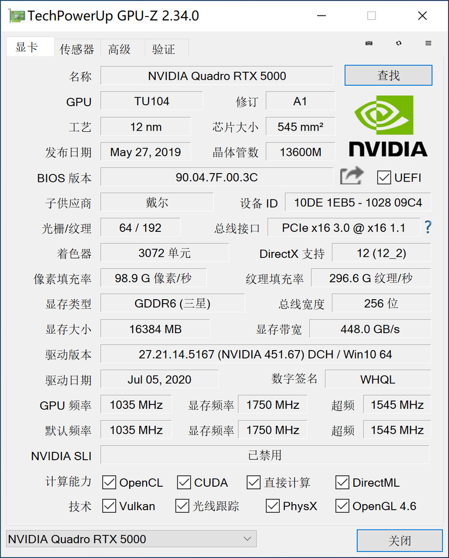 NVIDIA Quadro RTX 5000专业图形显卡采用TU104核心,拥有3072个CUDA核心,配备16GB GDDR6显存,支持光线追踪,能够更轻松应对专业的3D图形处理、工业设计、AI应用、VR等,效率更高。相比普通游戏显卡来说,专业显卡可以更高效率应对复杂的专业需求。