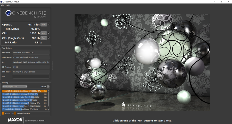 Cinebench R15多核得分为1830,单核得分为208。