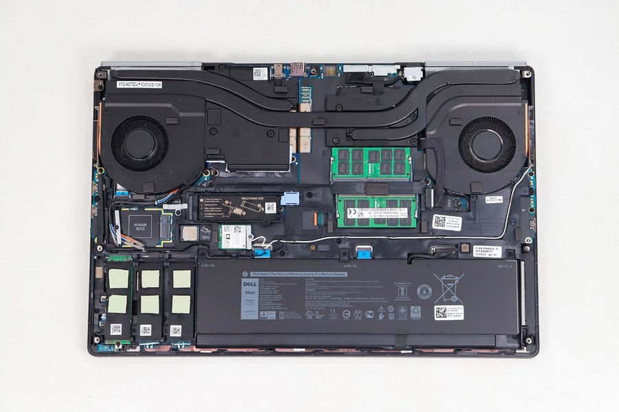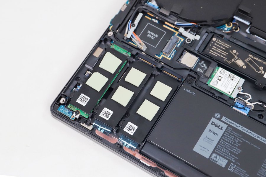 戴尔Precision 7750工作站拥有4个M.2 SSD仓位,高可同时配备4个SSD。电池上方的一个SSD仓位支持快拆,左下角配备有三个SSD仓位,每个SSD仓位都配备了散热片。