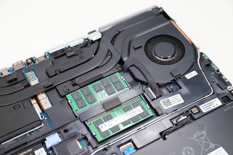 戴尔Precision 7750工作站底盖的拆卸比较简单,只需把底盖的螺丝拧下即可。可以看到散热器体型庞大,可以加速热量导出。图片中只能看到两条内存,由于评测机是配备了四根内存的,所以另外两根应该是在主板的另一边。