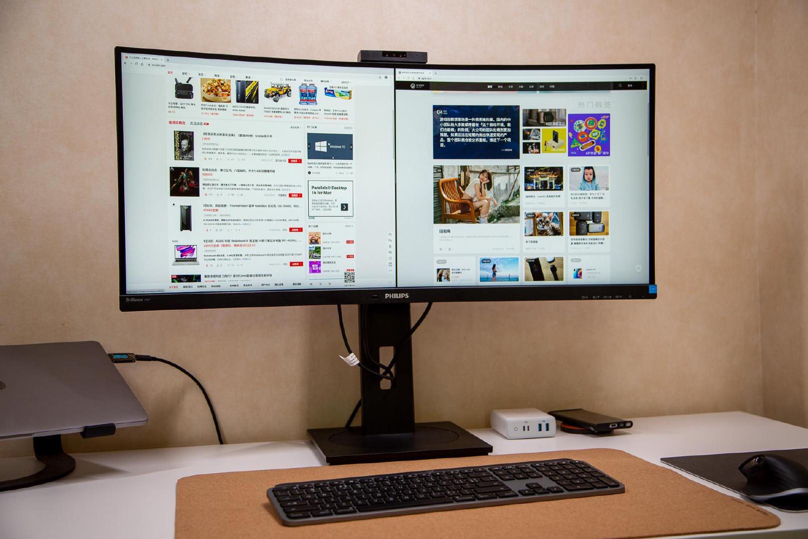 “先说PBP,也就是双屏功能,结合21:9的屏幕比例,可以显示出两个1720×1440的窗口,避免了传统显示器组双屏时中间出现边框的问题。考虑到笔记本显示屏的高度和飞利浦346P1CRH显示器的高度不同,频繁的抬头低头比较麻烦,开启PBP后就可以显示在同一个显示器上。另外,在全屏游戏时,还想快速关注到其它页面的信息,又想省去切换页面的操作,那么PBP是很好的选择。”