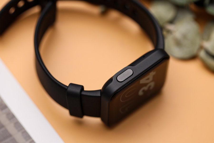 从侧面看这款Redmi Watch小方屏也非常纤薄,完全没有厚重的感觉。而在表身上没有太多的按键,仅设计有一个按键,可进行开/关机以及点亮屏幕、返回主屏等操作。