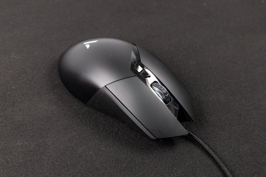 鼠标尺寸为139.1×72.4×41.6mm,外观造型比较修长,握持时可以提供很好的承托,即使稍大手型使用也能获得饱满的支撑。鼠标重量约为104g,这样的重量适中,玩游戏时不会太轻飘,也不会有很沉的感觉。