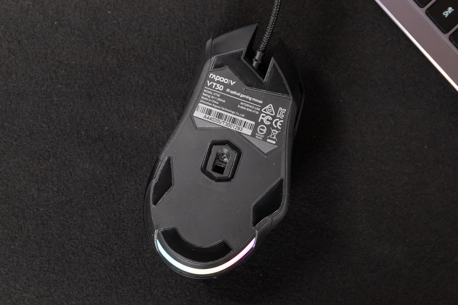 鼠标底部共配备了五处脚垫,可以让鼠标滑动更加顺畅。