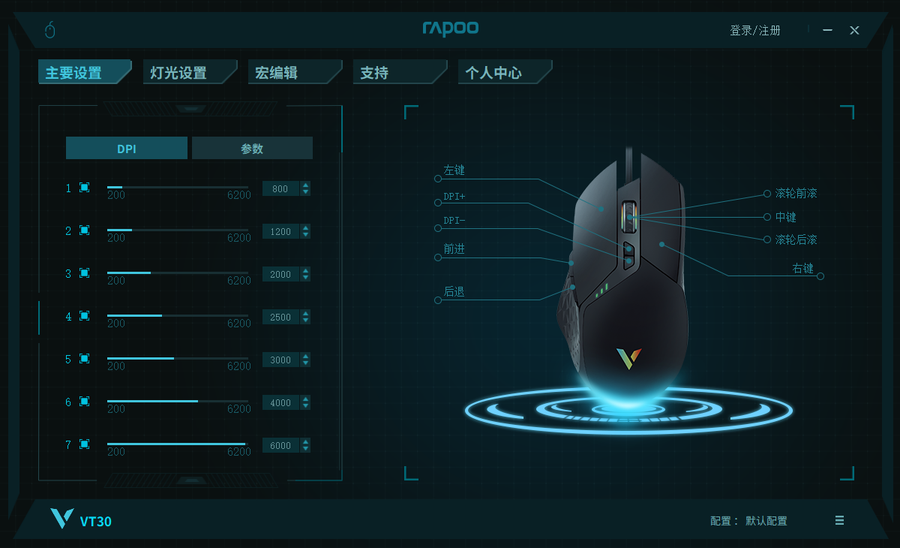 雷柏VT30幻彩RGB游戏鼠标采用原相PMW 3327光学引擎,支持高6200 DPI,鼠标支持7档DPI切换。这款光学引擎还拥有220 IPS最大追踪速度、20G最大加速度、1000Hz的回报率,定位精准,可以轻松满足普通用户的游戏需求。