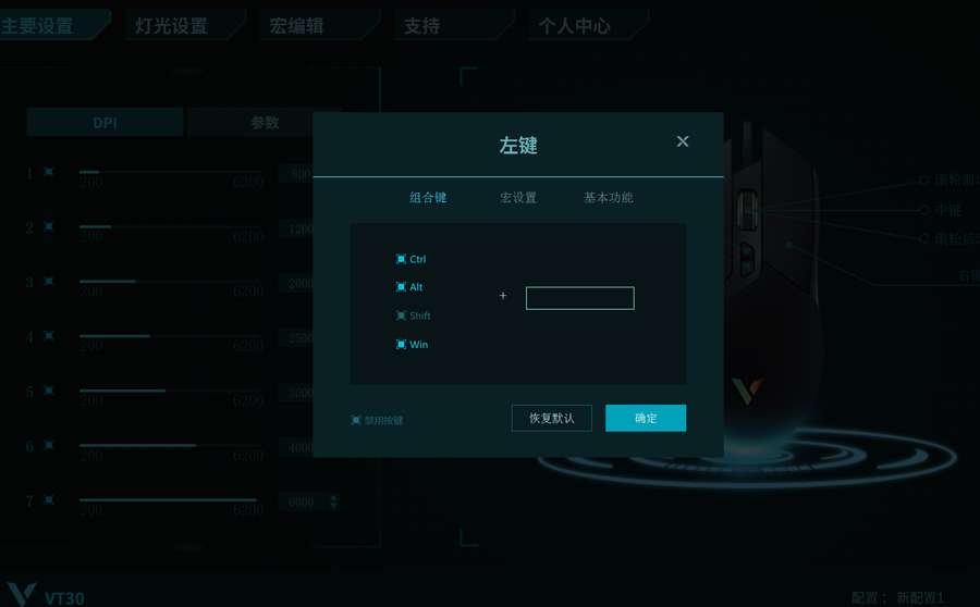 通过驱动还可以设置每个按键的功能,也可以录制宏,一键就能实现复杂的操作,按键可组合的方式繁多。需要注意的是,左下角的狙击专属火力按键是没办法自定义按键功能的。