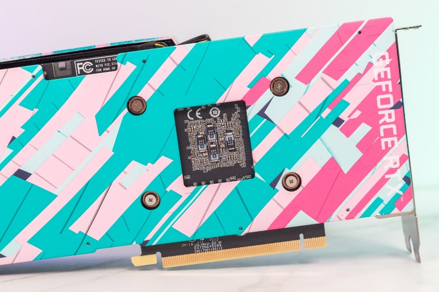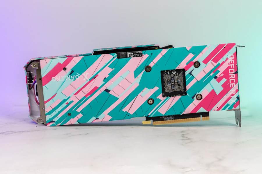 显卡长度为762.5px,比公版的700px长一些,背面的一体化金属背板同样采用了青与粉的撞色设计。