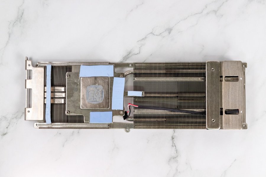 拆解后,索泰RTX 3060Ti X-GAMING OC的散热器采用镜面铜底直触的设计,可以更好的与GPU核心进行接触,从而高效的冷却GPU。散热鳍片分布均匀,做工精细,摸上去没有割手的感觉。并且散热器为导热贴都留下了预留位置,保障PCB上各种元器件的高效散热。