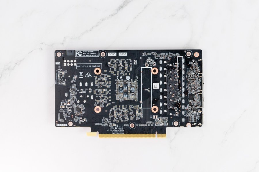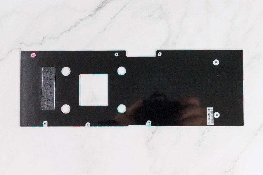 最后是背板,在核心供电的位置贴了一条导热贴,可以帮助金属背板更好的承担起辅助散热的作用。