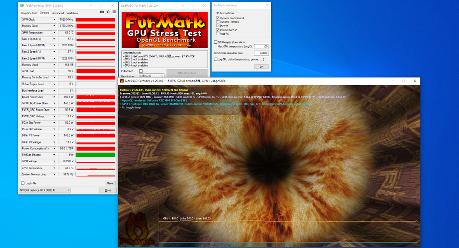 室温23°C,在30分钟的FurMark显卡满负载测试中,索泰RTX 3060Ti X-GAMING OC的核心频率最终稳定在1.6GHz左右,温度控制在65°C上下,表现不错。整卡实际功耗约200W,与TDP基本吻合。值得一提的是,在温度不高的情况下,这张显卡的风扇还保持得非常安静,转速只有1300转,不凑近听几乎很难察觉。