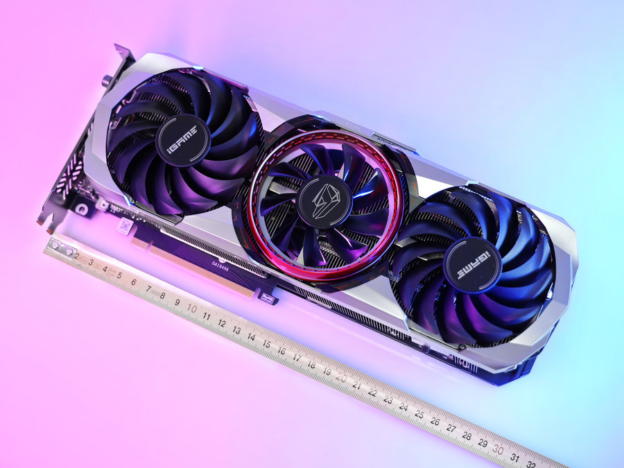 由于采用了三风扇散热设计,这款显卡的尺寸是比较长的。经过笔者的实测,这款显卡长度约30cm。