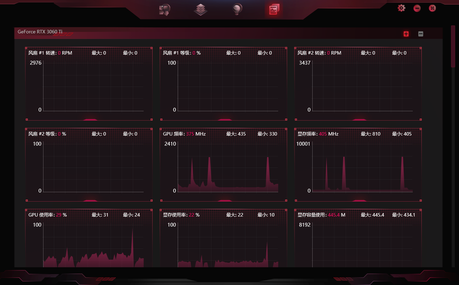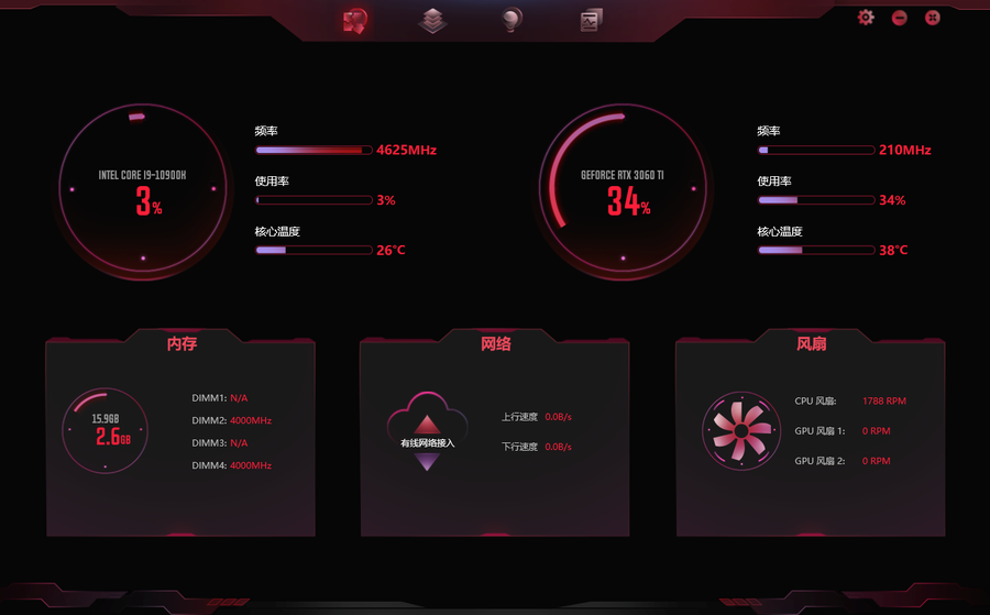 主界面可以监控系统状态,包括CPU、显卡、内存、网络等等。