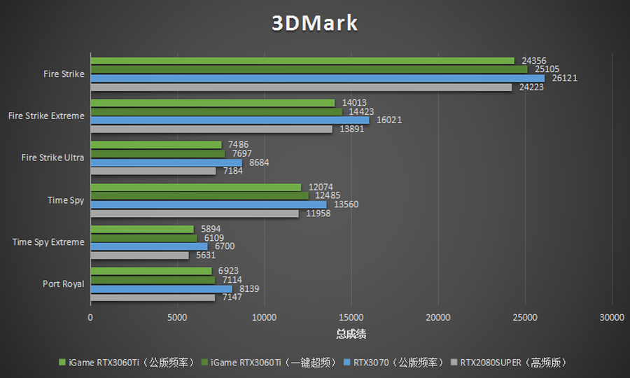 从3DMark基准测试的成绩来看,iGame GeForce RTX 3060 Ti Advanced OC显卡在一键超频之后,有了比较明显的性能提升。