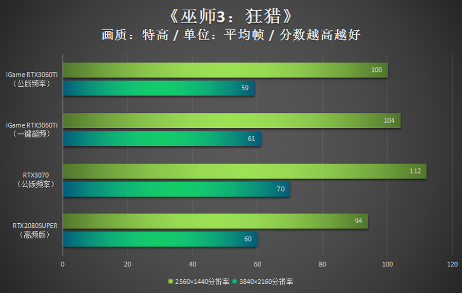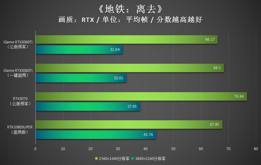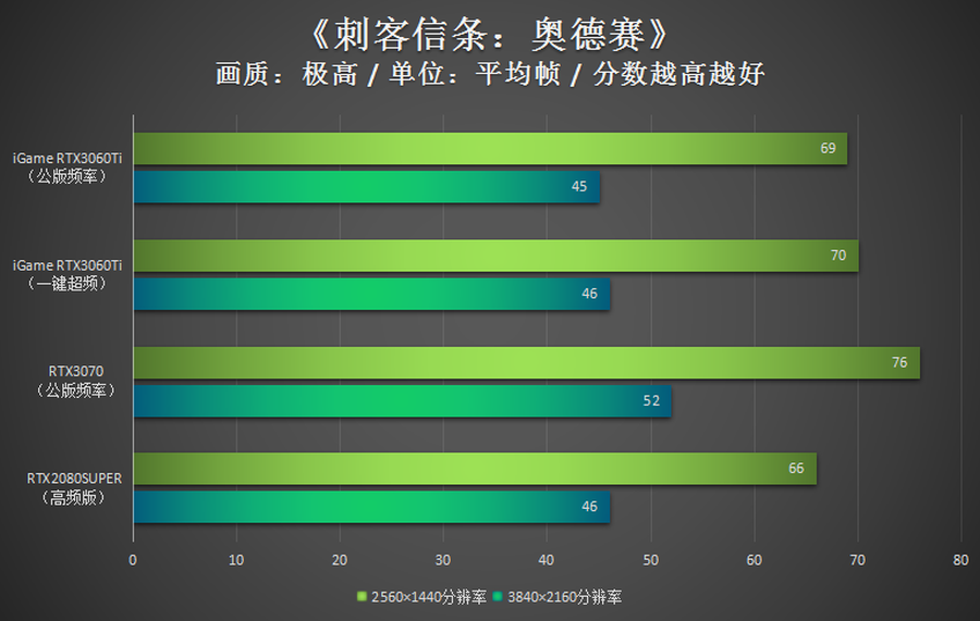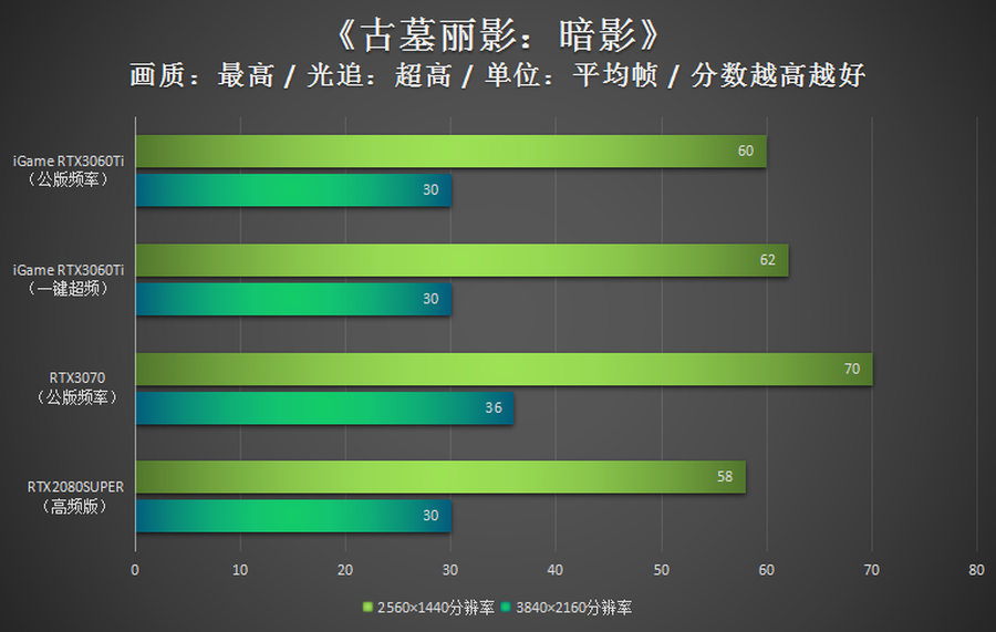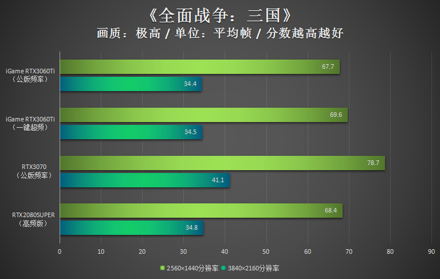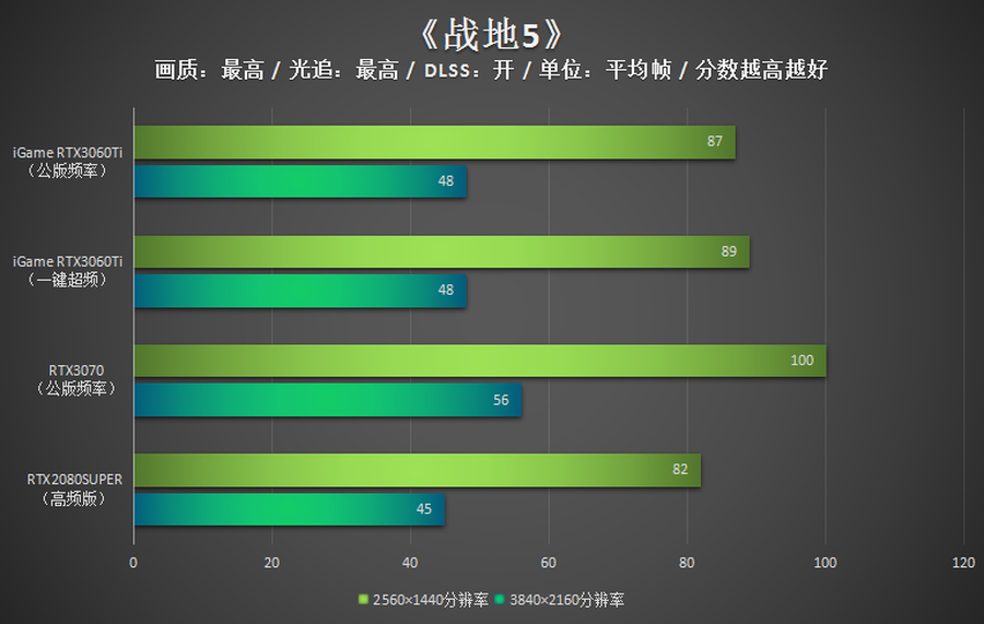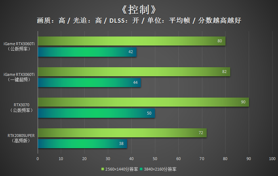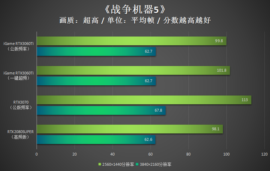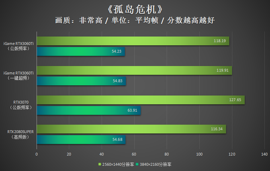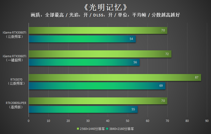 此次测试,为了对比iGame GeForce RTX 3060 Ti Advanced OC显卡的成绩,笔者还加入了一款RTX3070非公版显卡以及一款RTX2080SUPER非公版显卡的成绩。其中,RTX3070非公版显卡的频率与创始人版保持一致,而RTX2080SUPER非公版显卡则是一款高频版显卡,其Boost频率为1830MHz。
