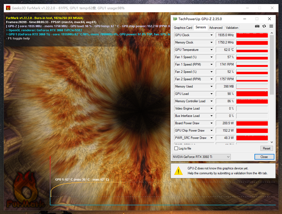 默认频率下,满载时GPU温度稳定在62℃,此时的风扇转速为1757 RPM,噪音很低。
