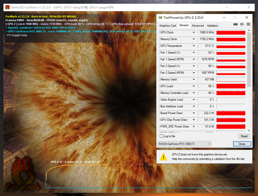 在一键超频状态下,满载时GPU温度稳定在67℃。此时的风扇转速为1887 RPM,噪音依旧比较低。