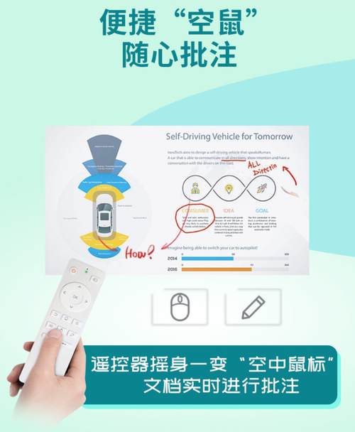明基E582投影仪还搭载了语音控制、空鼠遥控批注等功能,可通过语音助手直接跳转菜单、搜索功能,也可通过空鼠对准一按,即刻选中。甚至还能调出画笔,对投屏画面进行批划注释,让它的遥控器摇身变成“空中鼠标”。