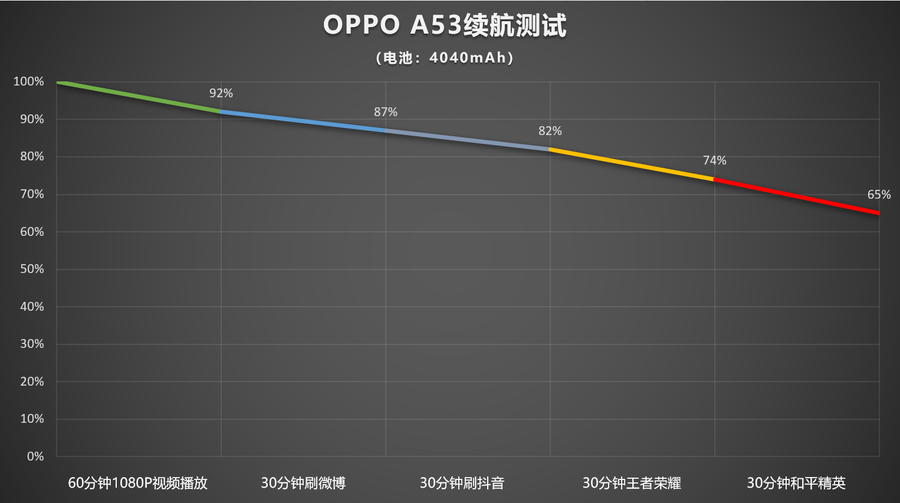 OPPO A53内置4040mAh电池,支持10W充电,这部分我们也按照日常使用场景进行测试。续航部分包括在线看1080P视频、刷微博、抖音,玩游戏环节,屏幕亮度保持在50%。