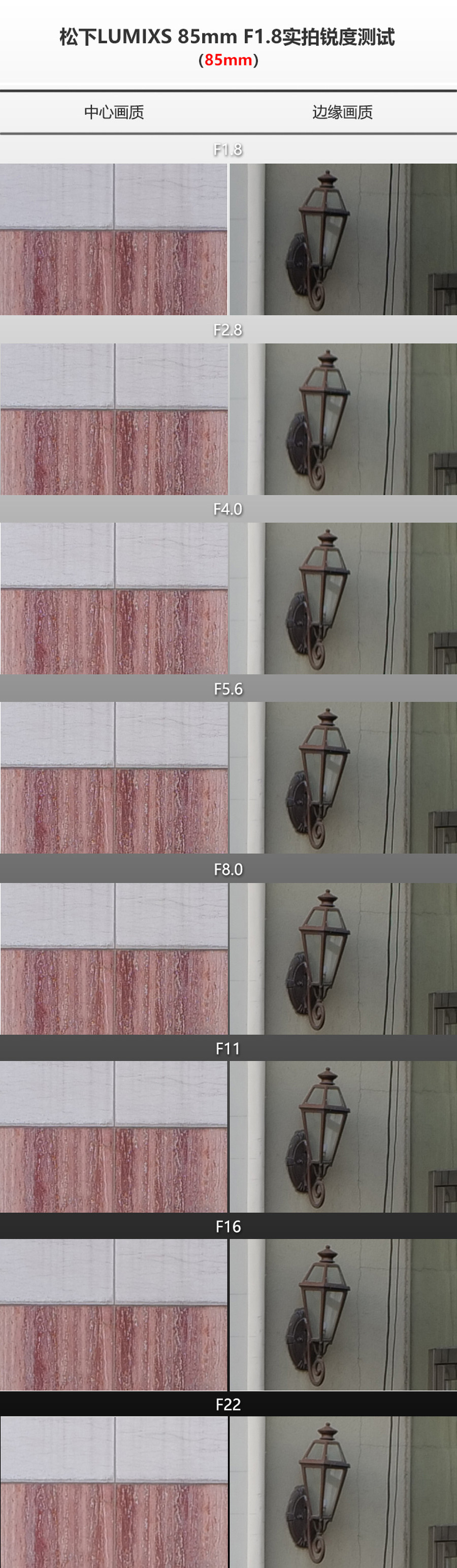 松下LUMIX S 85mm F1.8镜头的光圈范围为F1.8-F22,从上面的截图来看,在最大F1.8光圈下就已经获得非常不错的画质表现,无论是中心还是边缘都保持了较高的清晰度;而在缩一档到F2.8光圈后画面不同位置也都保持了非常高的锐度,个人认为这枚镜头在F8.0-F1光圈下画质非常好的。但让我比较意外的是LUMIX S 85mm F1.8在小光圈下也表现出非常高的画质水准,即使是使用F22最小光圈,也没有出现严重的小光圈衍射现象,边缘位置画质也仍在可用范围内,基本上从最大光圈到最小光圈,这支LUMIX S 85mm F1.8都有着出色的表现。