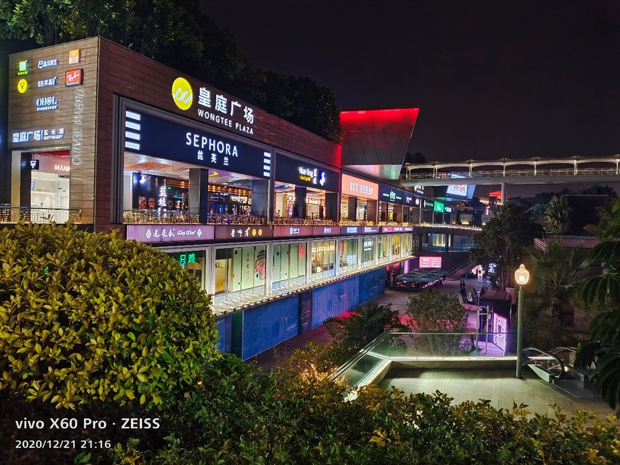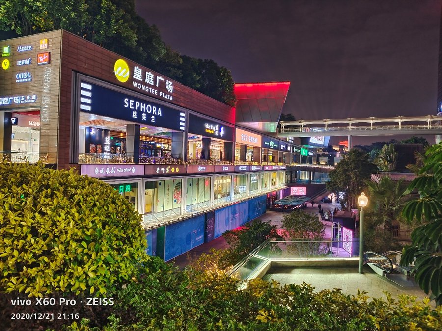 在夜拍方面,vivo X60 Pro默认模式下就已经能够拍到出色的照片,默认模式亮度足够,对高光部分处理得很好,对场景的色彩、氛围还原得很好。