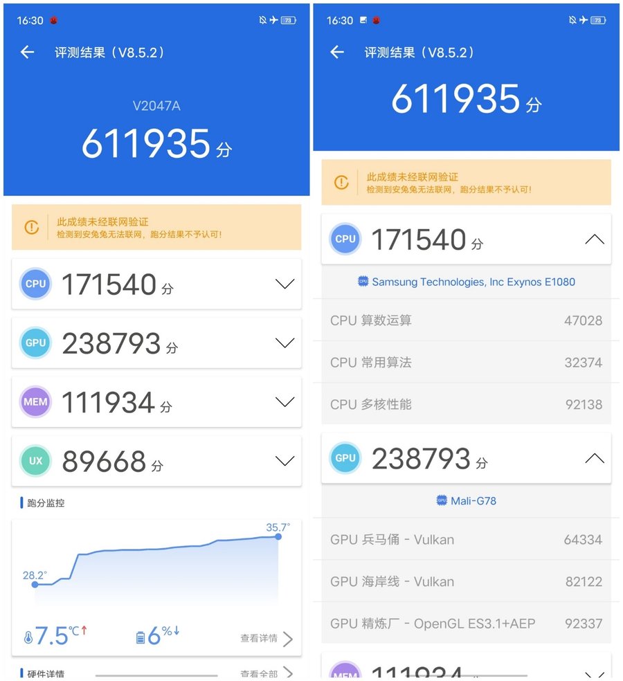 跑分方面,vivo X60 Pro的安兔兔跑分达到61万+,跟旗舰级骁龙865芯片的跑分差不多,拥有旗舰级的性能表现。相比上一代采用的骁龙765G芯片,vivo X60 Pro的性能有跨越式提升。